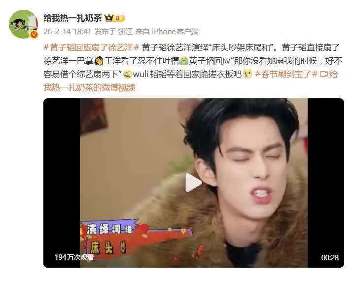 据2月14日网友爆料,黄子韬在综艺节目《宇宙闪烁请注意》中突然扇了徐艺洋一记巴掌,这一举动立刻让两人冲上了热搜榜。面对舆论的热议,黄子韬用一句幽默的话回应:那你没看她扇我的时候,好不容易借个综艺扇两下,这番话让整个风波充满了欢喜冤家的调侃气氛。