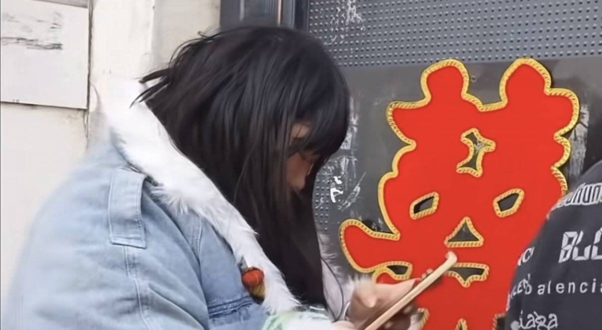 她穿了一件比较修身的大衣,把头发也挽了起来。还戴着红色格子围巾,这副打扮很有气质、也特别喜庆,身板挺拔、真有范!