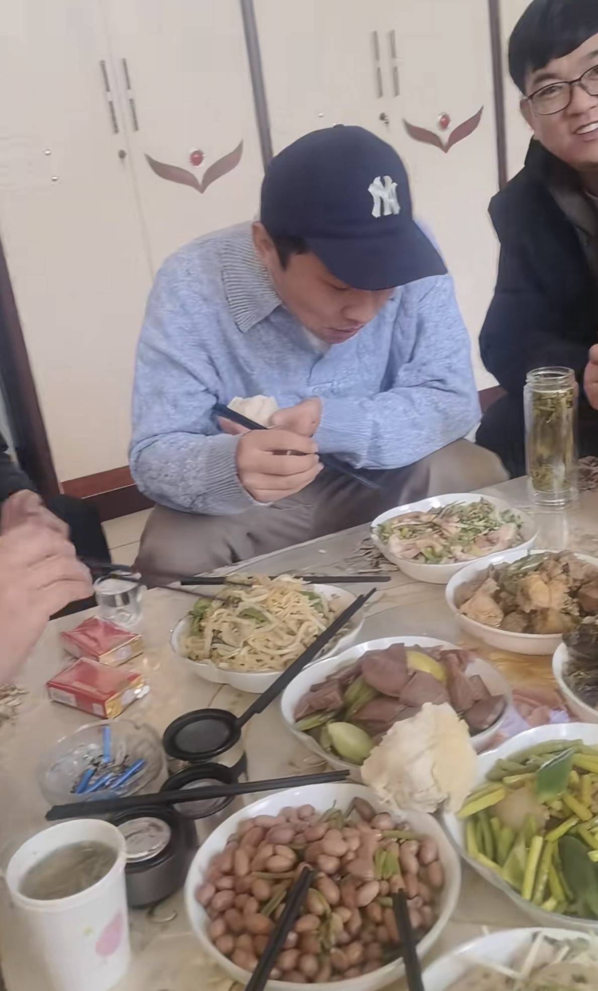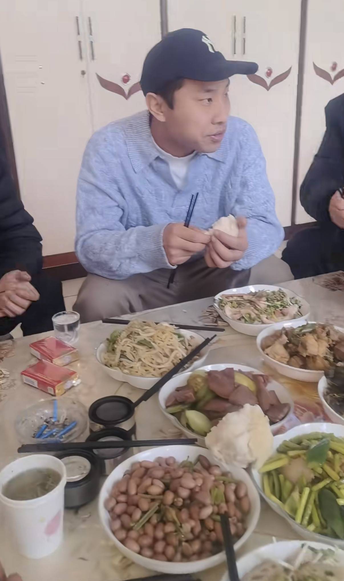 徐志胜的右边是表哥,左边也是一位年龄相仿的男士。大家应该都是为了陪徐志胜,他好不容易回来一次,希望他能吃得尽兴、玩得开心。