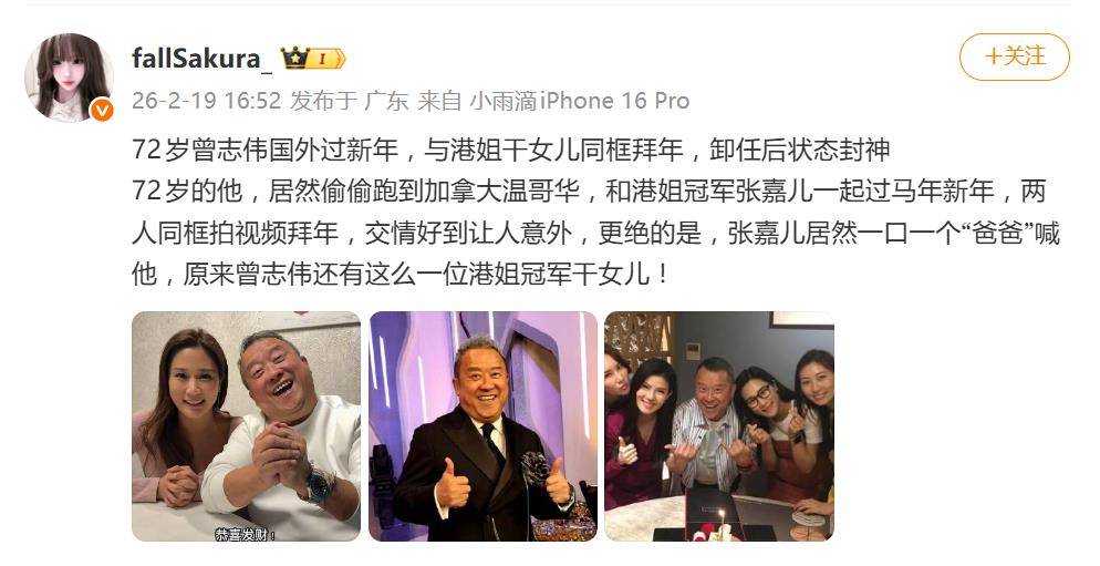 不过,这“父女”温馨拜年的画面,也引来了一些网友的对比和猜测。亲生女儿曾宝仪近年来其实常陪伴父亲,2026年春节也有家庭合影流出,但这次曾志伟却选择与干女儿在海外共度新年,难免让人对其家庭行程安排产生好奇。