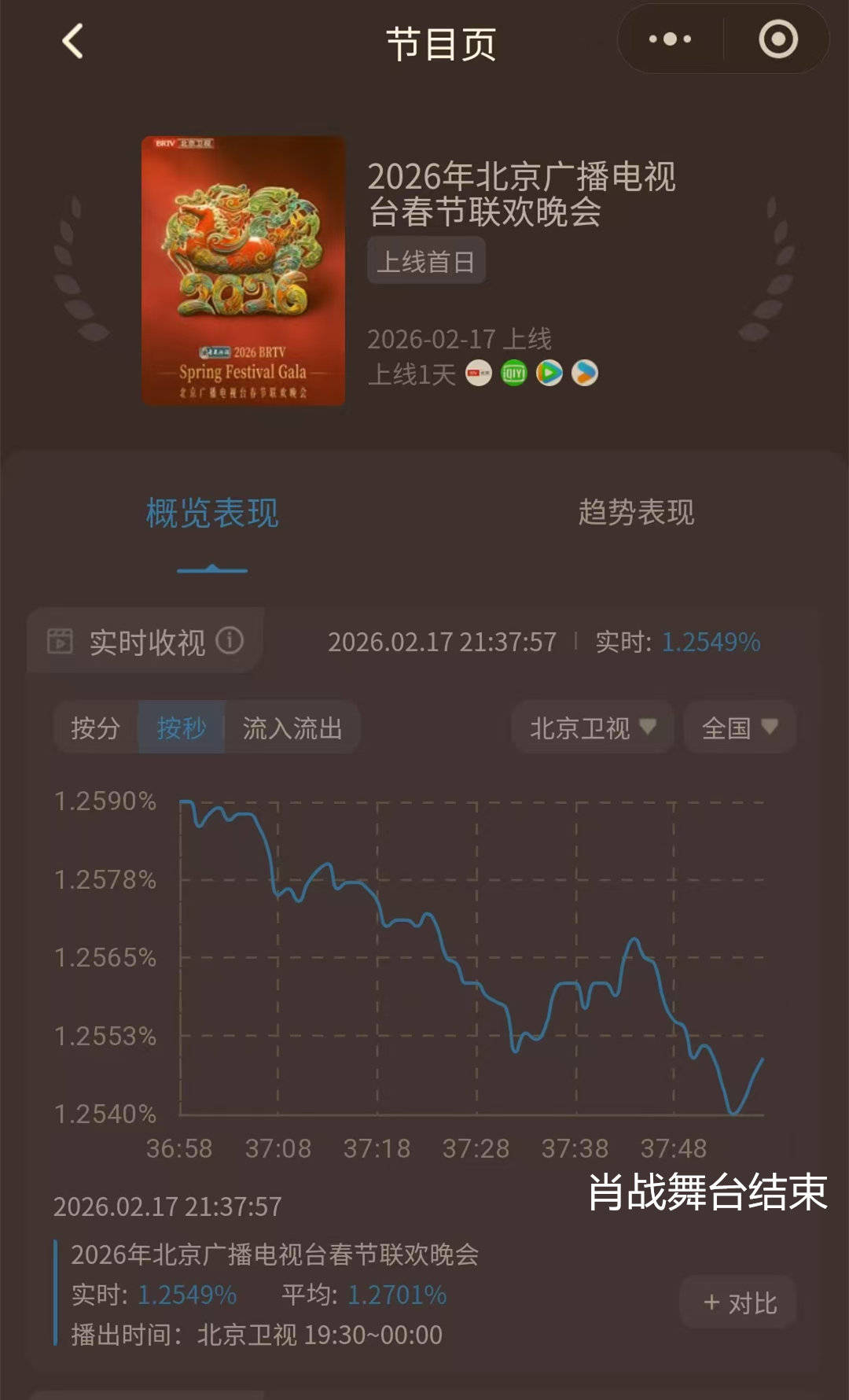 其次,节目整体表现优秀,稳居歌舞类前三。根据酷云数据,肖战《岁岁年年》的平均收视率为1.27%,峰值达到1.30%,在北京台春晚所有歌舞类节目中稳居第三。这证明节目本身具有稳定的收视吸引力。