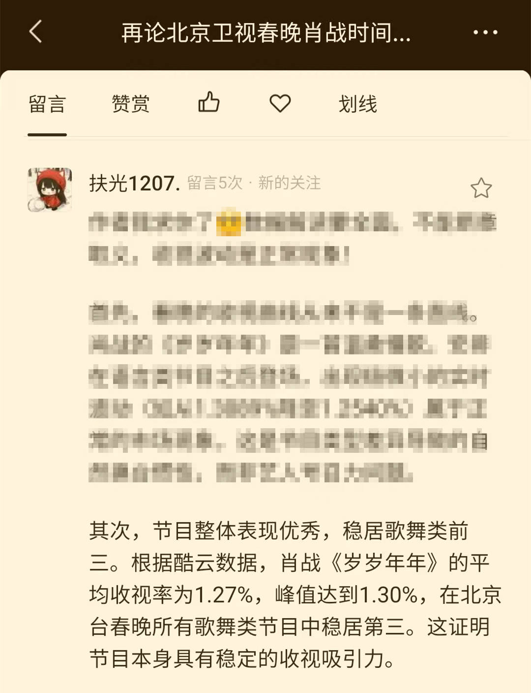 我昨日通过严肃数据说理的方式,再次论证了肖战《岁岁年年》节目在北京卫视春晚舞台上出现收视率直线下滑的问题。道理越讲越明,数据越引用越清晰,绝大多数的读者朋友都认可文章观点,并且愿意对此进行人文层面上的关怀与思考。但是,依旧有几位读者,颠倒黑白,继续制造假消息。比如说,文章的留言区域当中,出现了这么一个留言内容: