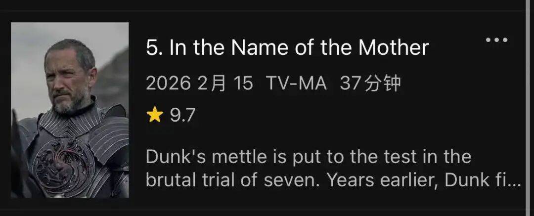 尤其是刚播出的第5集,口碑极佳,被公认为是权游宇宙中最顶尖的单集之一。