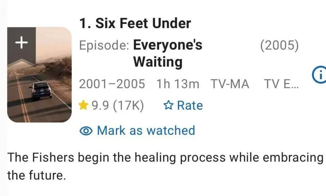 六尺之下》的大结局凭借一万七千人打出的9.9分,悄然坐收渔翁之利,接替登顶了目前IMDb单集评分的榜首。
