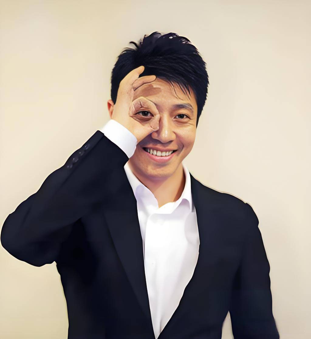 他身着黑色西装,头发乌黑亮泽,面部皮肤光洁紧致,额头、眼角、脖子上没有皱纹,看上去至少比实际年龄要小5岁。