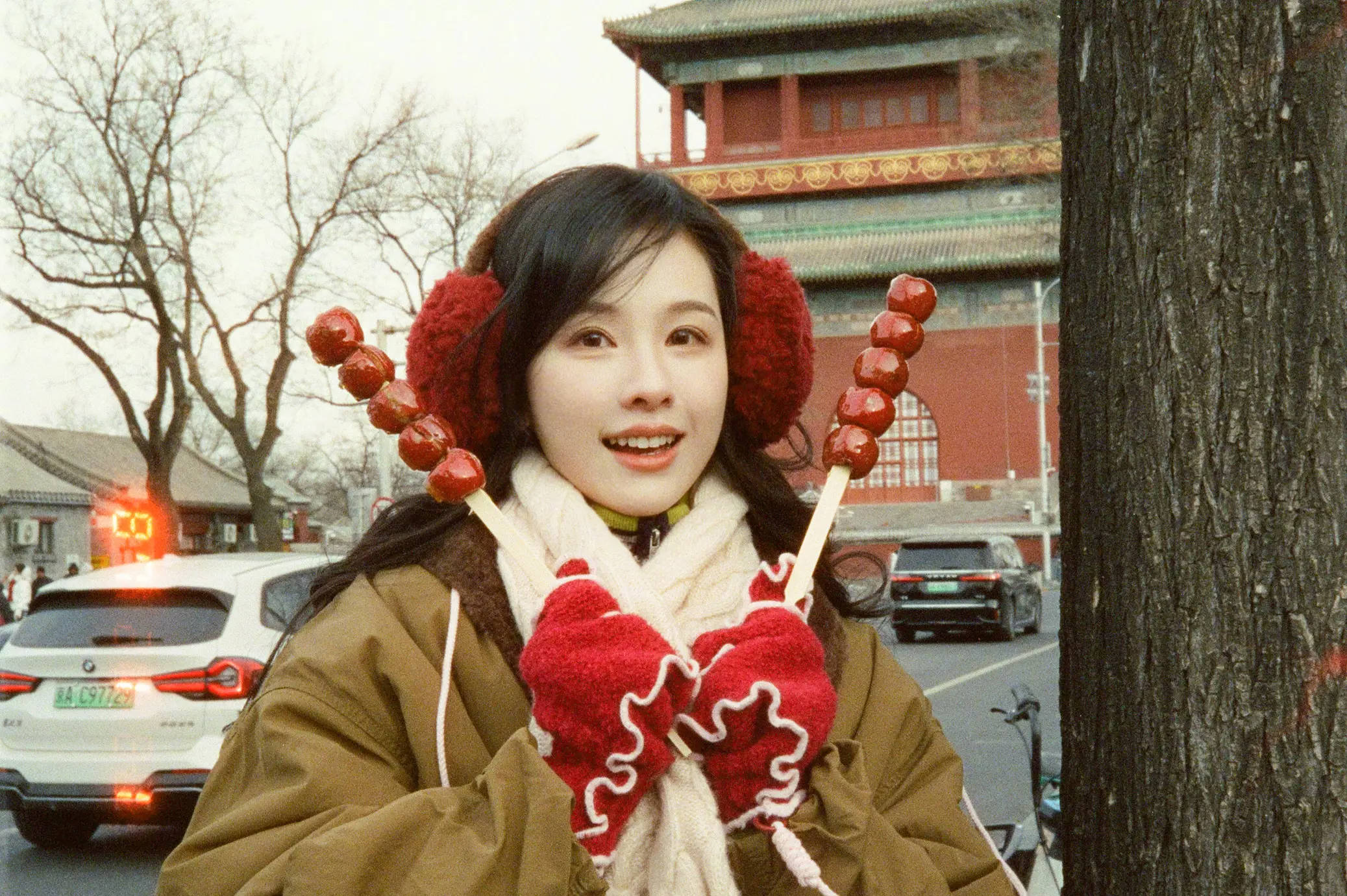 陈都灵手捧两根糖葫芦。