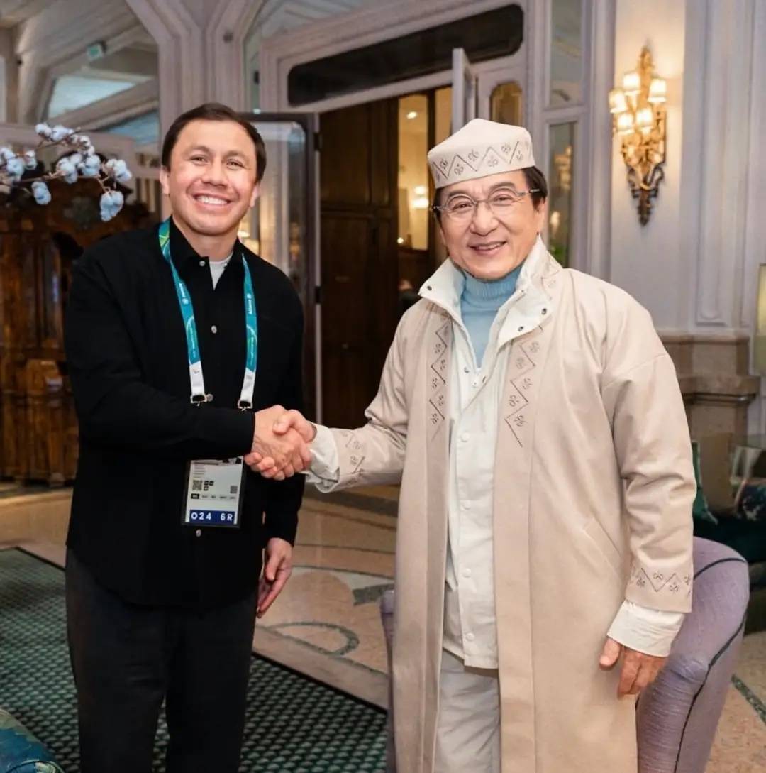 这位功夫影星,不管到哪都很受欢迎。从运动场离开后,成龙又和拳击运动员戈洛夫金合影了。