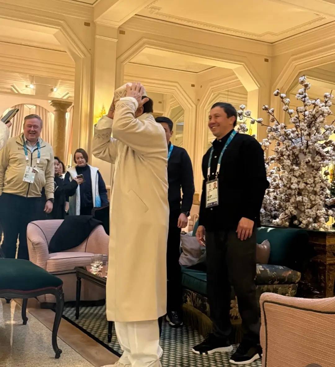 成龙还入乡随俗的换上了当地的特色服饰,带着特色刺绣的浅咖色外套,还有同款帽子,感觉跟新疆那边的服饰也比较相似。