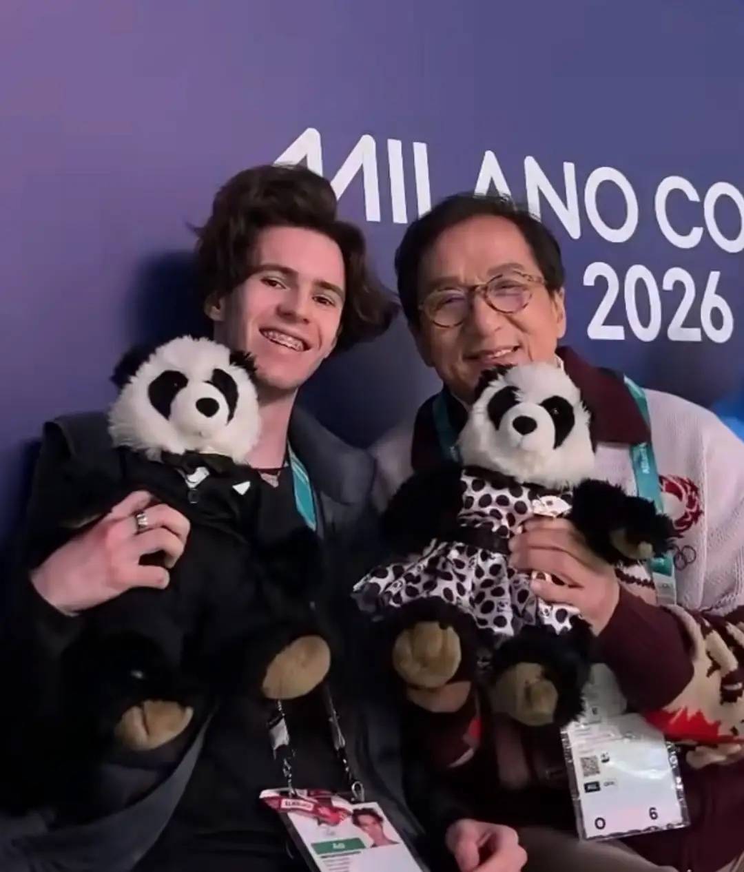 萨多洛夫穿的也是熊猫款的服饰,两个人拿着熊猫玩偶,这个画面还真是有趣。成龙笑意满满、越老越慈祥。