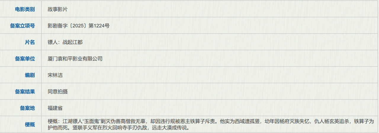 《镖人:战起江都》(也就是《镖人2》)去年就已经备案。备案地为福建省,和《镖人》一样。备案单位依然是厦门袁和平影业有限公司,备案结果为同意拍摄。