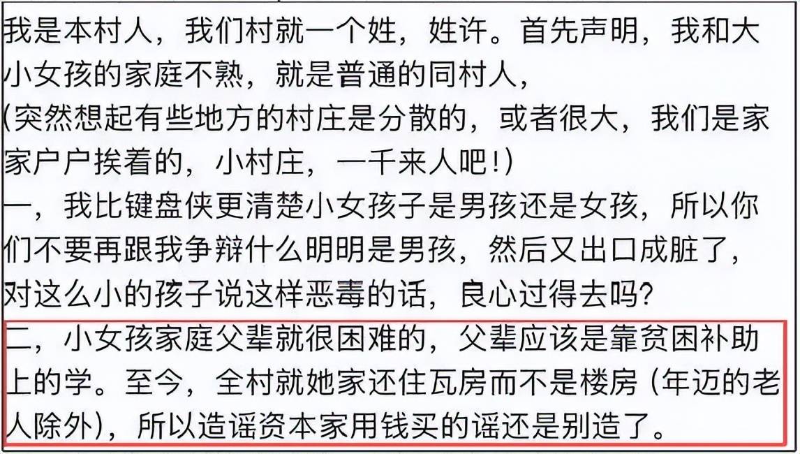 而后,有网友翻出早前村民为10岁女童澄清的消息,当中一些爆料细节与通报相互呼应。有村民称村里一共一千来人,10岁女童家庭从父辈起就生活困难,父辈上学靠贫困补助,而今村里只有他们家还住瓦房,其他人都住楼房,特别强调个别老人除外。
