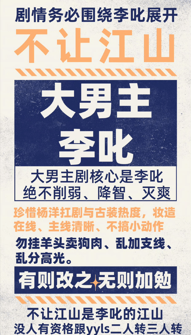 一部以“不让江山”为剧名、以李叱逆袭为核心的大男主剧,却抽走男主的灵魂,捧高配角,这不仅是对原著的亵渎,更是对演员付出的辜负。#不让江山剧本维权# #停拍整改# 话题迅速刷屏,粉丝联合书粉大规模发声,要求剧组还原人设、整改剧本,守住作品初心。