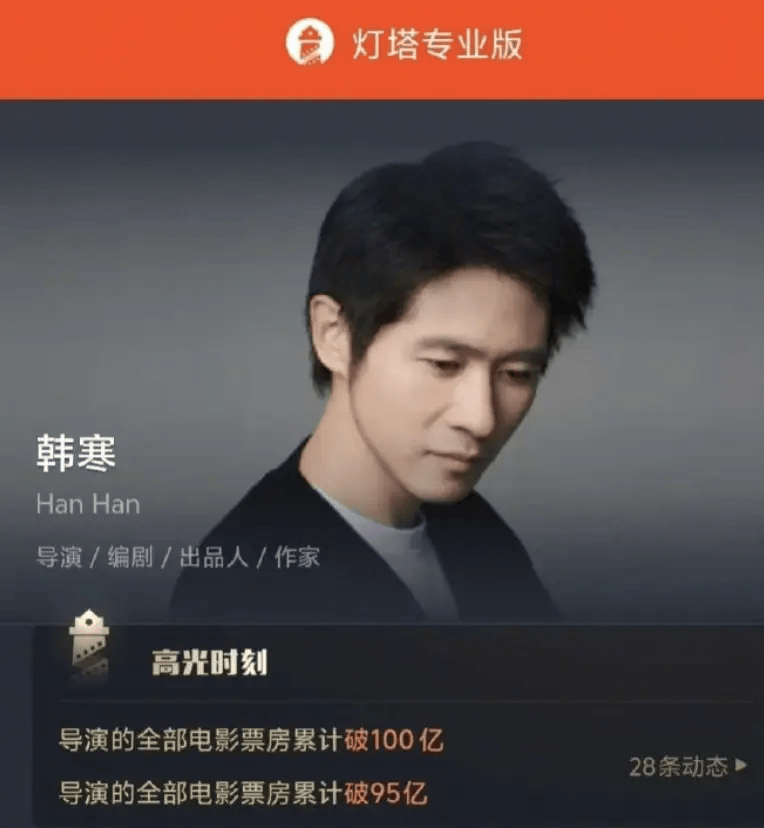 据灯塔专业版数据,韩寒导演电影累计票房已破100亿,作品包括《乘风破浪》《飞驰人生》系列等。