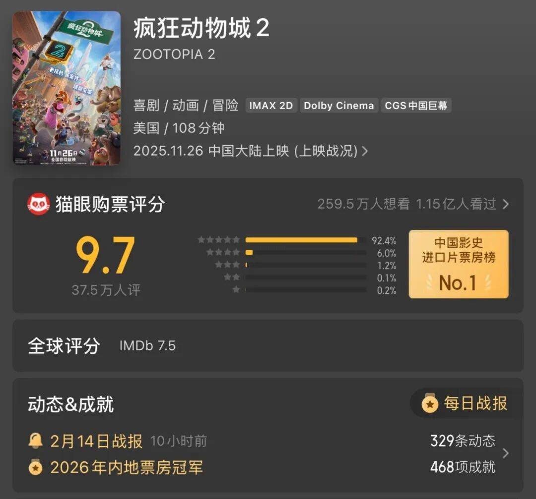 还是《疯狂动物城2》,它已经上映快三个月了。