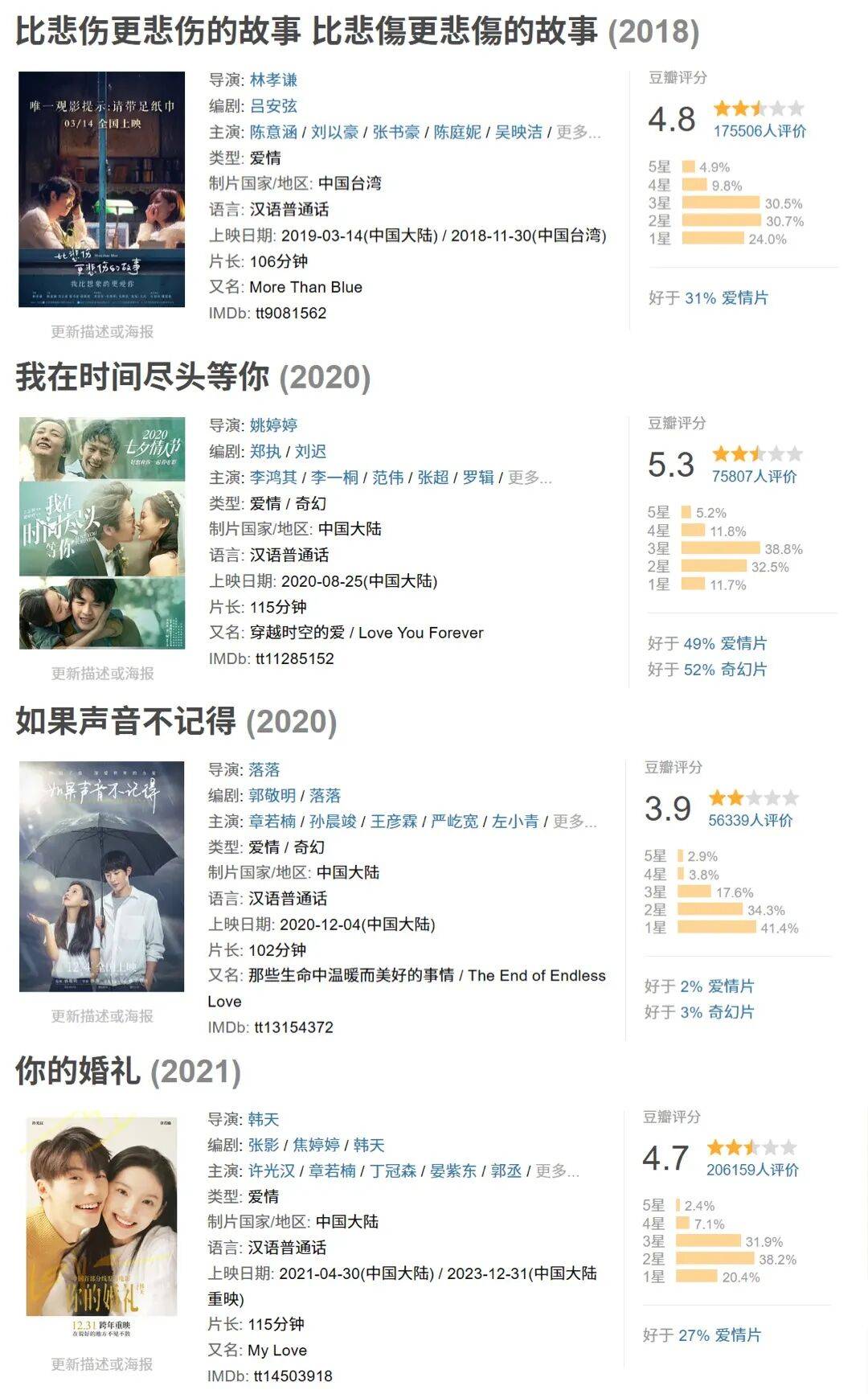 从2019年开始,翻拍自韩国电影的《比悲伤更悲伤的故事》、2020年的《我在时间尽头等你》《如果声音不记得》《你的婚礼》等尽管也都拿下了数亿票房,但国内豆瓣评分只有3.9—5.3分左右。