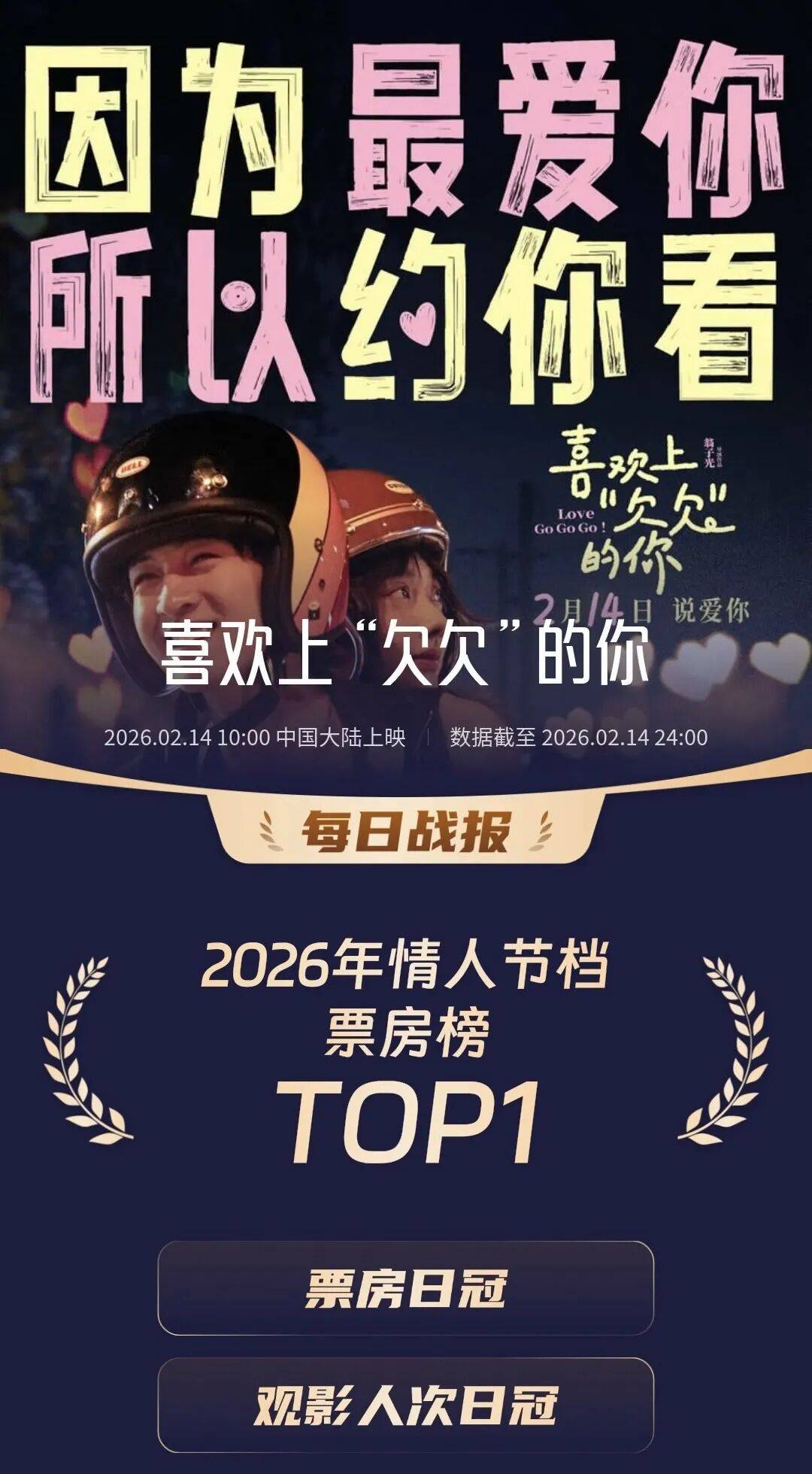 情人节档当日,《喜欢上“欠欠”的你》与《爱乐之城》票房与排片占比一度位列单日第一、第二名。随后《爱乐之城》排名迅速被《匿杀》及《疯狂动物城2》挤下。截至2月14日24点,情人节档上映新片最高票房仅为《喜欢上“欠欠”的你》。