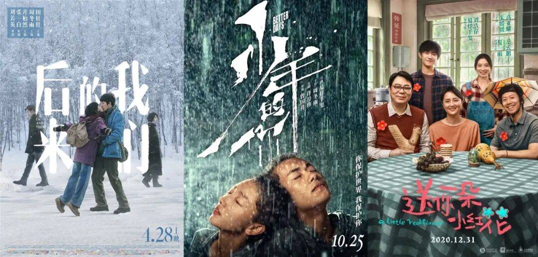 2018年—2020年,这一时期的爱情片还被包裹在正热的市场氛围中,也偶有话题性释放,如《后来的我们》对一线城市年轻人的情感解析,《少年的你》融汇青春爱情与校园霸凌产生了社会性话题,《送你一朵小红花》也验证了“流量+模式”的票房号召力,好在这些影片质量可圈可点,平均10亿+的票房也对得起观众的期待。