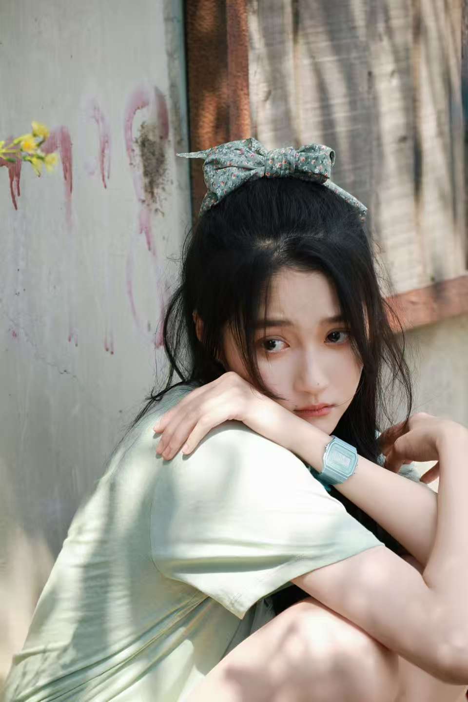 关晓彤扎碎花蝴蝶结,抱膝而坐。