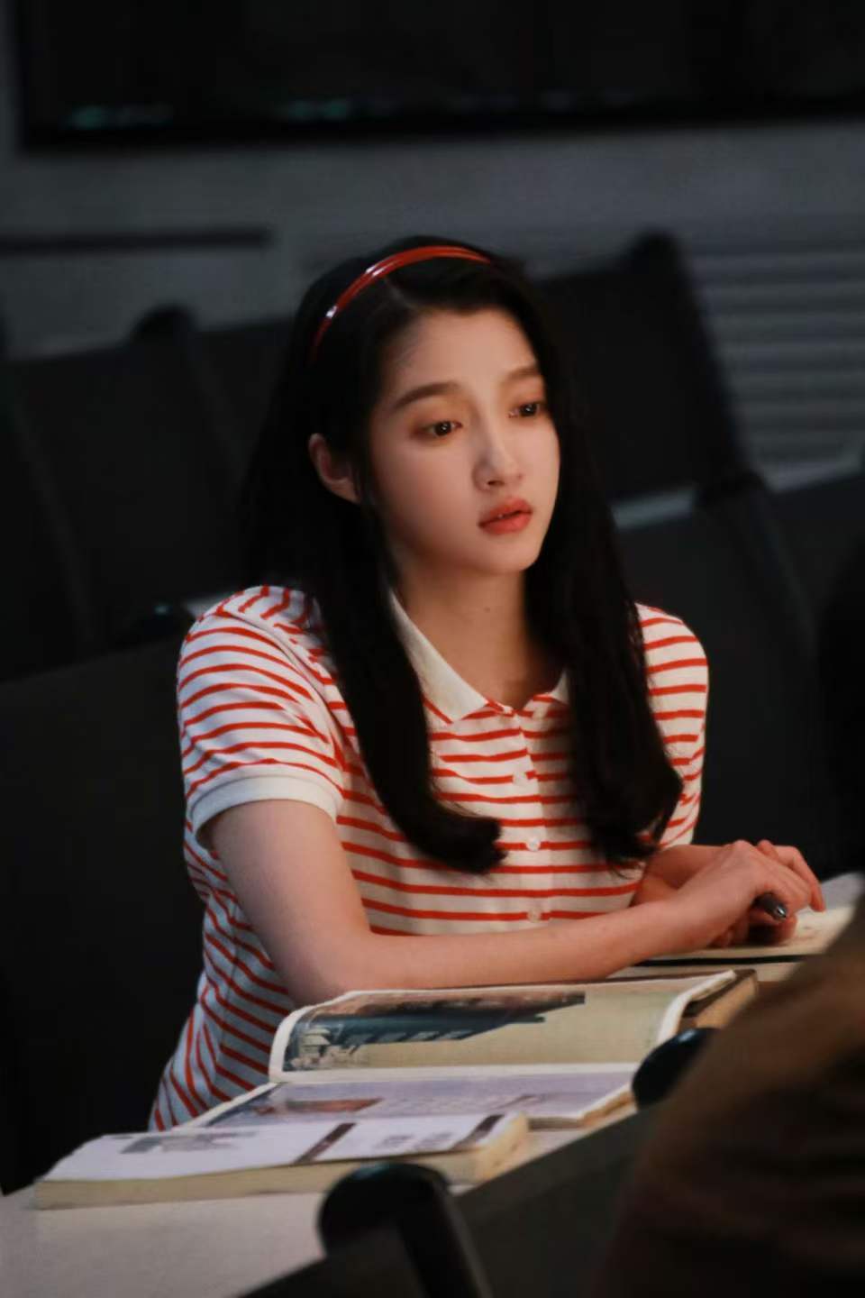 关晓彤戴红发箍,端坐桌前。