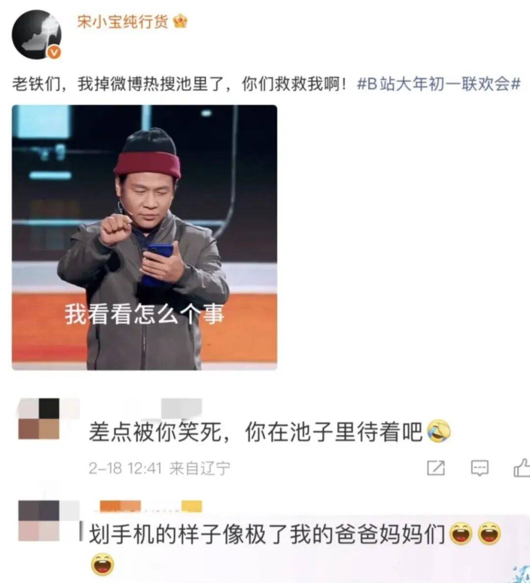 今年一个具有象征意义的案例,是宋小宝在B站春晚演绎短剧解构作品《重生之我在豪门当宝总》的意外破圈。而节目被讨论的原因,居然是因为一个“翻车名场面”,当宋小宝对着搭档没及时登场的舞台即兴说出“屋里人呢?那里面黢黑我干等着人呢!”时,这种脱离剧本的活人感反而促成了B站年轻用户的玩梗二创狂欢。