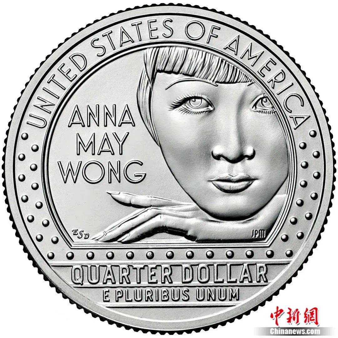 2022年,印着黄柳霜头像的25美分发行,硬币的浮雕上,大眼睛、柳叶眉的黄柳霜梳着标志性的齐刘海,细长的手伸展开来,衬着下颌。这套硬币属于“美国女性铸币项目”,共选择了20位对美国发展做出巨大贡献的女性。这是美国硬币上首次出现亚裔面孔。图:印着黄柳霜头像的美国硬币。