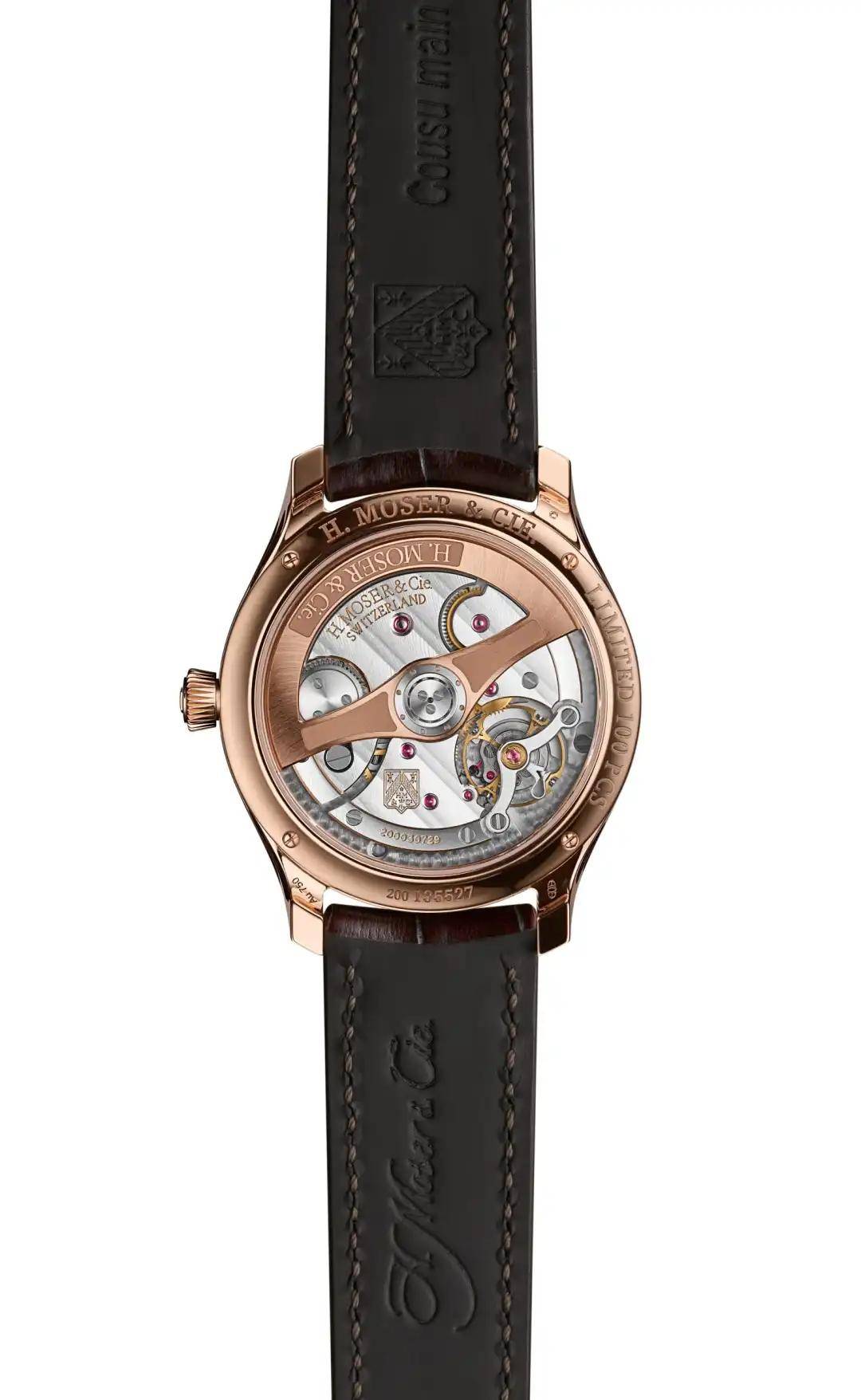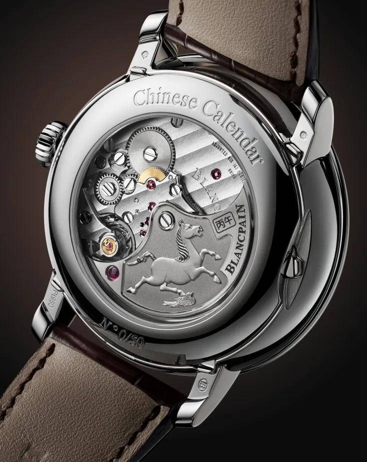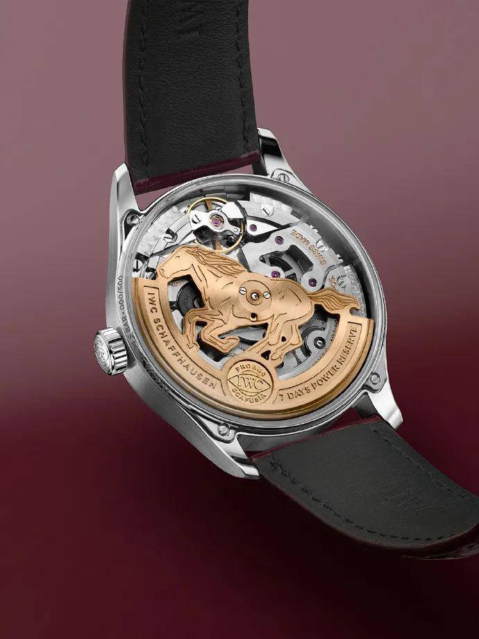 翻过背面,透过蓝宝石底盖,可以看到金色的摆陀被做成了奔马形状,寓意动力源源不断,限量500枚。