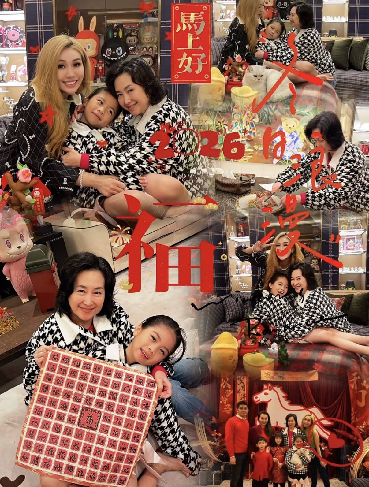 姐妹、姨甥仨在豪宅庆祝新年,从被公开的照片来看,豪宅布置得相当喜庆,很有新春氛围。在大厅的一个背景墙上,还挂了一块深红色的布帘,上面贴了一匹马的图案,两边是大红的春联,下面还堆放了各式各样的礼物盒。而在大厅的沙发背后,摆放了一个玻璃柜,里面装满了各式各样,各种规格的LABUBU,相当显眼。从豪宅的格局以及风格来看,应该就是何超盈在香港的五亿豪宅,所以是她专程邀请了姐姐何超琼来做客,过新年。