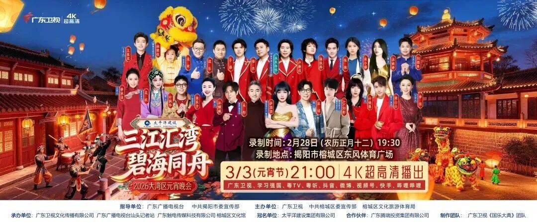 由广东卫视、中共榕城区委宣传部、榕城区文化旅游体育局联袂主办的《三江汇湾·碧海同舟——2026大湾区元宵晚会》官宣落地揭阳。这场以“古今交融、同心奋进、侨心相连”为主线的佳节盛会,将于2月28日(正月十二)在揭阳东风体育广场、揭阳古城录制,3月3日(正月十五)在广东卫视及新媒体矩阵同步播出。
