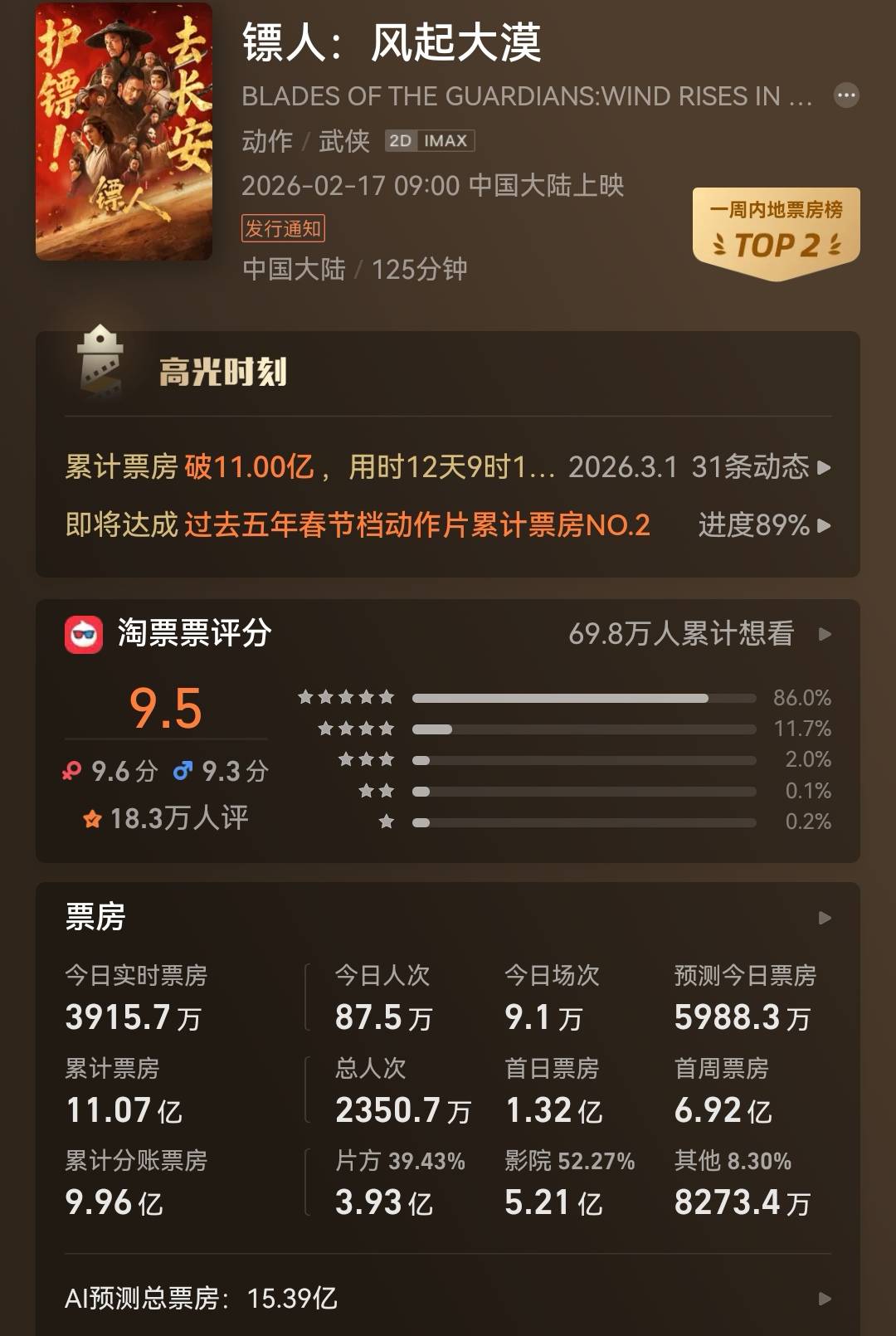 搜狐娱乐讯 (哈麦/文)3月1日,在上映第13天,武侠电影《镖人》累计票房突破了11亿元,投资方分账3.83亿元,接近4亿。