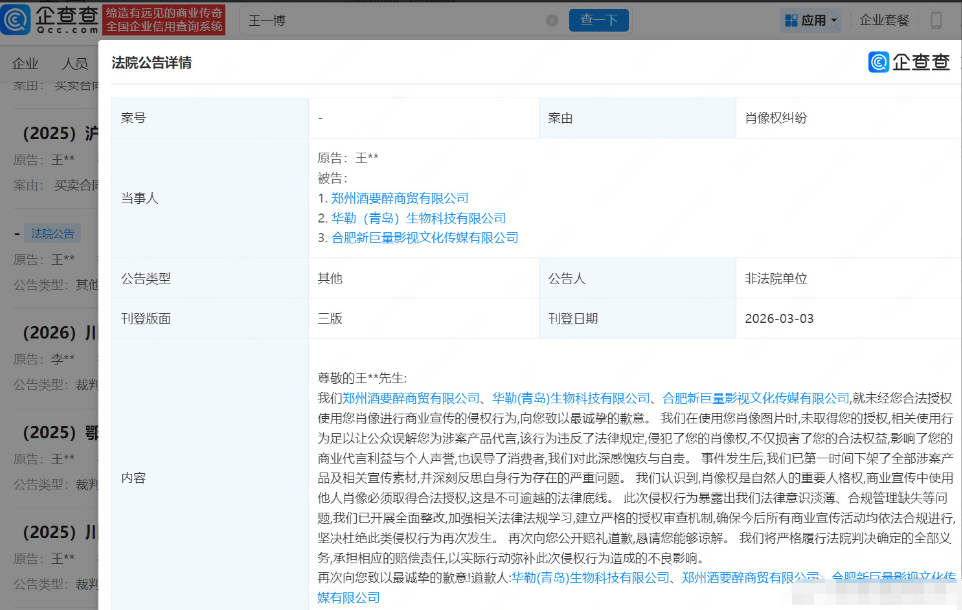 搜狐娱乐讯 企查查APP显示,近日,郑州酒要醉商贸有限公司、华勒(青岛)生物科技有限公司、合肥新巨量影视文化传媒有限公司公开向王一博赔礼道歉,上述公司在未经王一博合法授权的情况下使用其肖像进行商业宣传,构成肖像权侵权。目前涉事商家已下架全部涉案产品及相关宣传素材,并承诺将严格履行法院判决确定的全部义务,承担相应的赔偿责任。