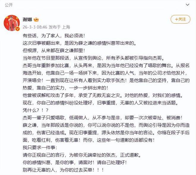 2026年3月2日,薛之谦的私人情感纠纷被公开爆料,其中顺带提及薛之谦私下评价张杰唱歌风格的内容,同时将多年前的综艺争议言论重新翻出,直接打破了原本的平静。次日,谢娜正式通过社交平台表态,她明确表示,张杰从底层舞台一路打拼,所有的成绩都来自日复一日的练习与对音乐的执着,和外界传言的“依靠他人”完全不符。谢娜同时指出,薛之谦当年的言论虽未点名,却直接引导了舆论走向,让张杰长期承受无端的指责与攻击,即便张杰始终专注舞台、远离纷争,还是一次次被卷入无关的是非之中。在诉求中,谢娜希望薛之谦能够为自己的言论承担责任,向张杰正式道歉,并且妥善处理个人纠纷,不要再让无关的人承受不必要的伤害。