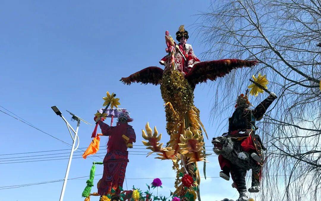 上午十时,随着炮响,社火队伍正式起程。被当地人称为“空中杂技”的高台,底部是特制的台架,中央是高达七米的铁艺或木制骨架。今年亮相的19台高台涵盖传统神话、历史典故与时代主题三大类别。表演者都是村里3岁至7岁的孩童,他们身着鲜艳的戏服,形态各异,部分高台还能原地360度旋转,引得围观群众阵阵惊呼。