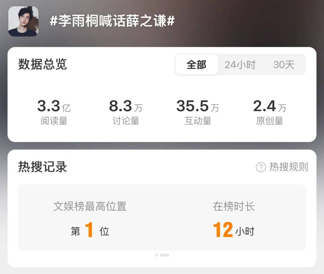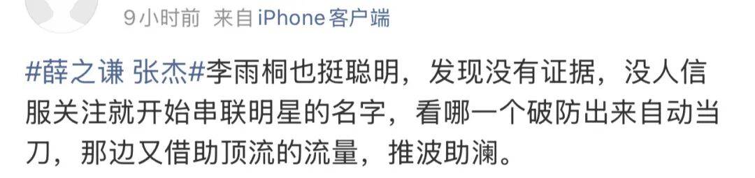 胡彦斌也无辜躺枪了。李雨桐一句“微博ip能查网暴是胡彦斌说的”,加上早年夸胡彦斌被薛之谦摔琴的旧料,直接把胡彦斌送上热搜,挂了一整天。