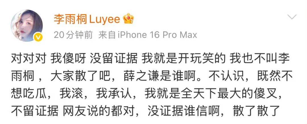 因为李雨桐这边,虽然嘴上喊得震天响,但迟迟没拿出能一锤定音的实质证据,发言还出现前后矛盾,甚至改口说“开玩笑的”、“没留证据”。
