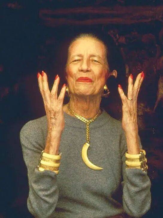 美国版VOGUE前主编Diana Vreeland的许多经典造型也由夸张的大首饰打造完成,她也是风靡时尚圈的传奇人物,喜欢佩戴硕大的手镯和巨型项链,再搭配鲜艳的红唇和浓烈的腮红。