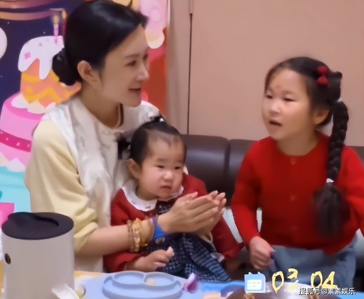 在生日派对上面,张导才1岁多的小女儿也是由妈妈杜星霖照顾。5岁的二女儿小花仙被妈妈杜星霖抱着,生日主角二儿子和哥哥马丁在一起坐着,大家一起吃着生日蛋糕。