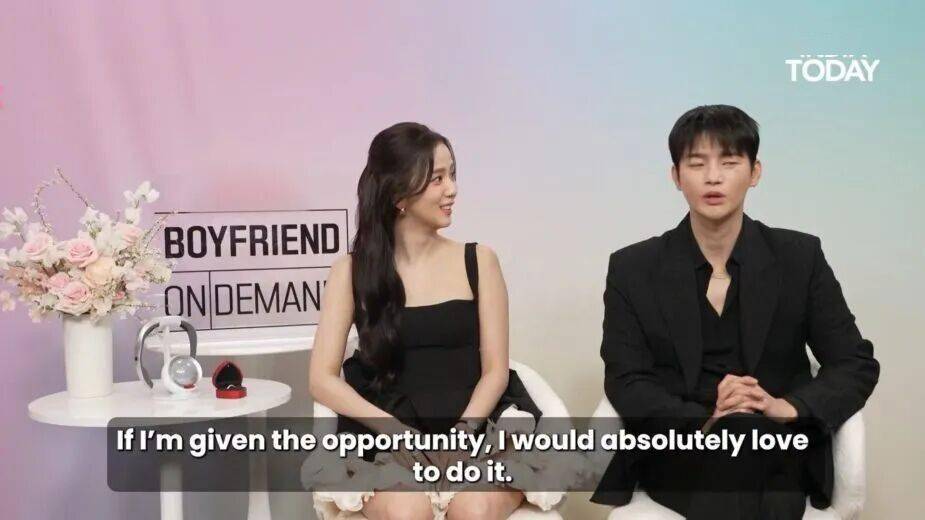 采访者的提问颇具巧思,结合新剧的AI设定,直接向两位发出邀约:“何时可能在AI设定下参与宝莱坞风格的作品?”并特别点出两人的歌舞才华与宝莱坞的适配度。徐仁国的反应迅速而直接:“如果有机会,我绝对非常乐意尝试。”Jisoo的回应则更显主动与期待,她笑着对采访者说:“希望您能促成此事,请多为我们留意机会。”——这已近乎是一次公开的“求职”信号。