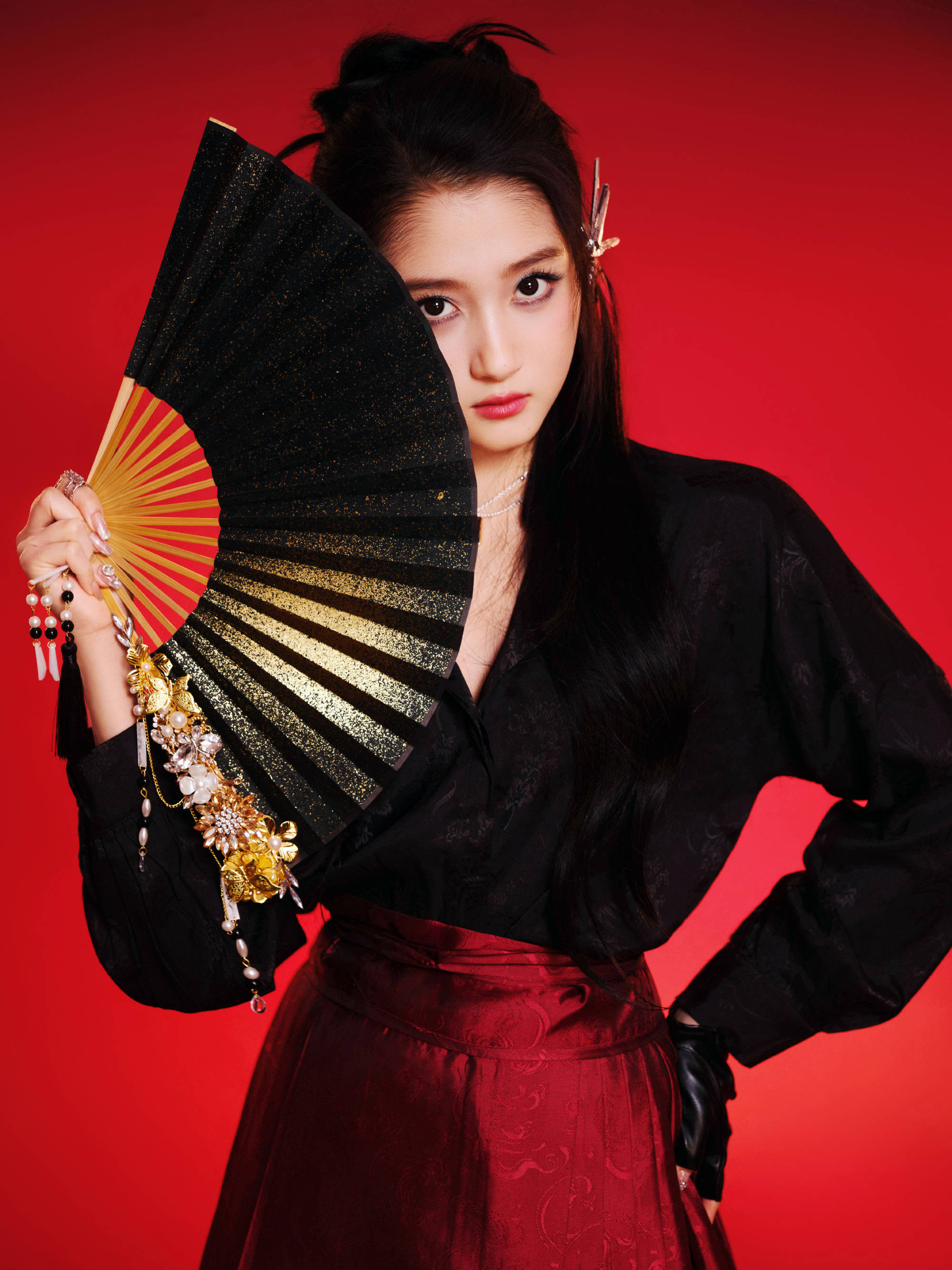 松垮的墨色衬衫比夜深沉,微微泛光的提花,偶尔带来一丝呼吸。鲜艳的马面裙,把千年风华穿进了Z世代,还很适配她高挑的身形。但最显功底的,还是那双马丁靴,刚柔并济之余,注入了“甜酷”基因。、