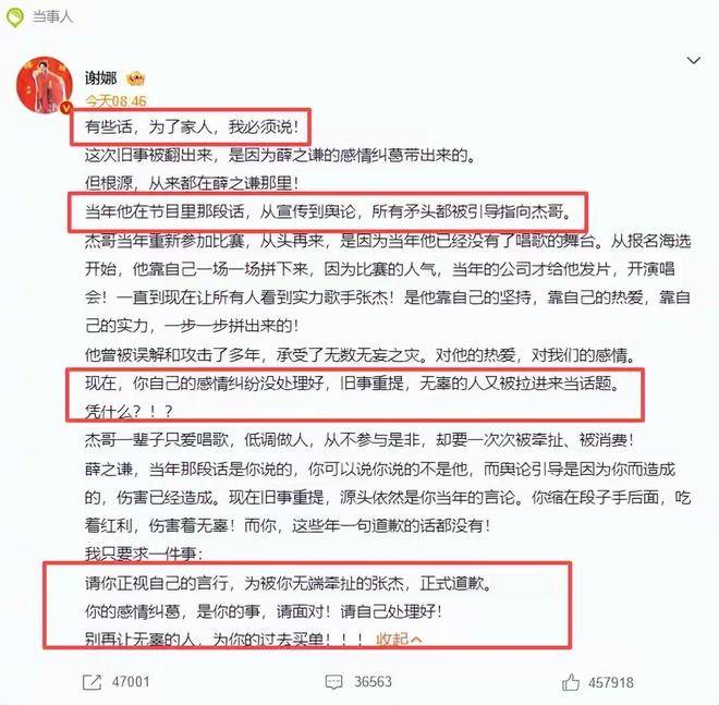 她在微博上发布长文,点名薛之谦,核心诉求很明确:当年那段在综艺节目里的调侃,被舆论一路推波助澜,最后落到张杰身上,因此她要求薛之谦就把无辜的人牵扯进来这件事,给出正式道歉。
