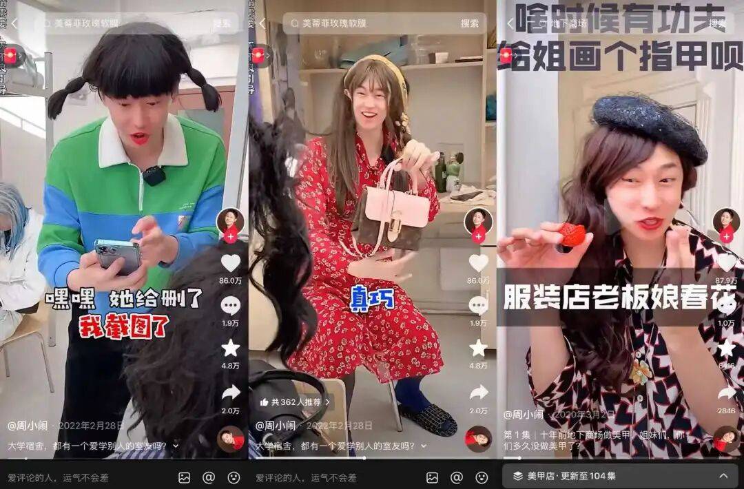 自此,“周小闹”开启了表演的大门,创造出了不少令人印象深刻的角色,比如《大学宿舍》系列中的钢铁直女赵丽赢、学人精白小莲;还有《地下美甲店》系列中,永远拿着一颗草莓的服装店老板娘春花。
