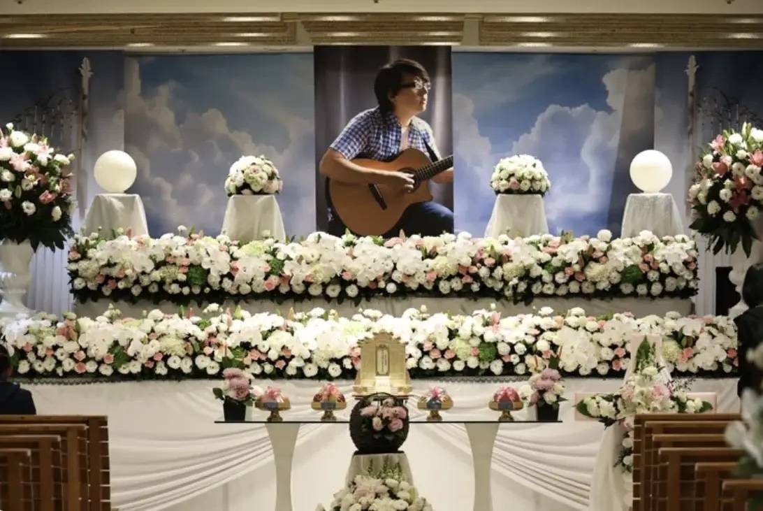 不少圈内好友都送了挽联、花圈、花篮,以白色花海为主要基调的灵堂,气氛庄严而温馨。刘若英、林俊杰等歌手都送来花篮。