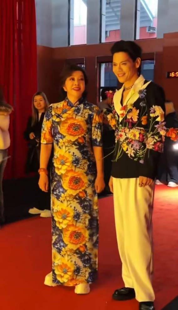 红毯上最吸睛的“意外组合”,非刘晓庆与向佐莫属。向佐一身白色西装,别出心裁地在腰间点缀了大片鲜花装饰,造型独特前卫,还被眼尖的网友调侃“是不是偷穿了郭碧婷的衣柜”。而刘晓庆则选择了一袭繁花似锦的旗袍,气场全开,脚下却混搭了一双运动鞋,将传统与不羁融合得恰到好处。当两人同框时,相似的配色与满身的花卉元素产生了奇妙的化学反应,被网友戏称为“满屏花花穿搭”、“这默契说是情侣装不过分吧”,相关话题火速冲上热搜。