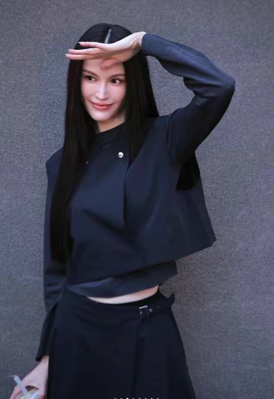 不过在何穗的近照来看,她的状态不错。穿黑色短外套、搭配高腰裙、配一双黑色短靴,这种all black的穿搭很飒美。