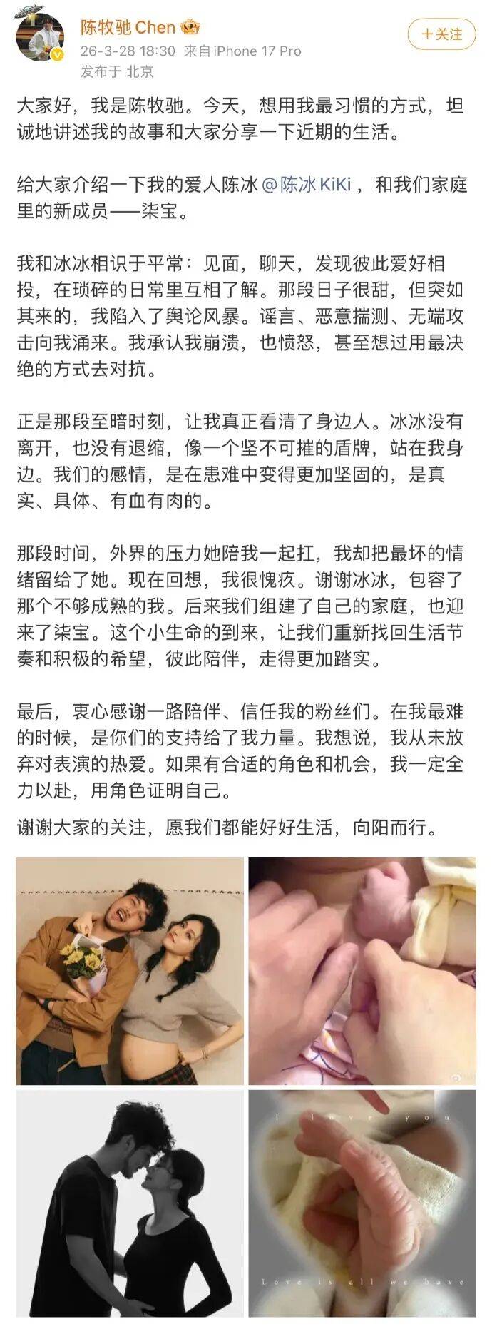 后面陈牧驰还贴了自己和陈冰的合照以及和宝宝小手一块拍的照片。