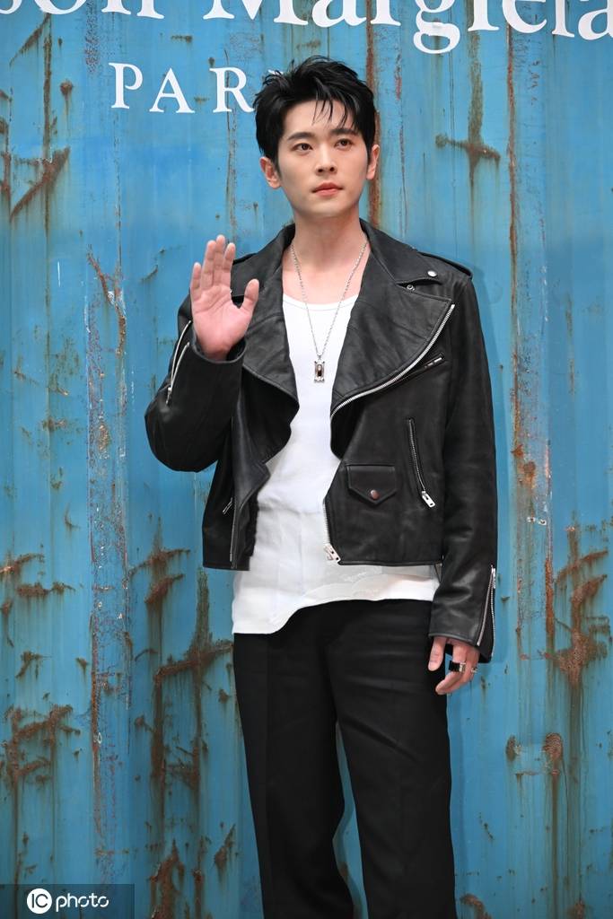 身穿品牌黑色解构皮衣宽翻领配金属拉链,内搭白背心,粗粝与精致互相碰撞。