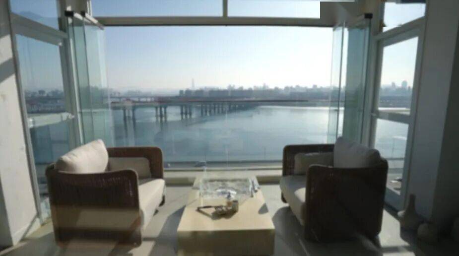 细节处更见心思。露台上低矮的茶几内竟巧妙嵌入了壁炉,为夜晚增添暖意与情调;整面的落地窗可以完全敞开,让汉江边的风自由穿梭。这已不仅仅是居住空间,更像是一个精心打造的艺术生活馆。