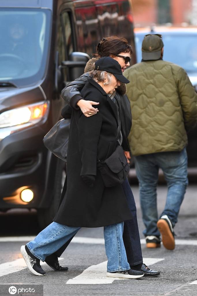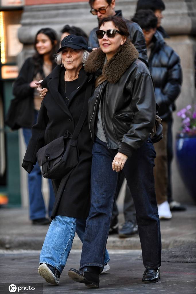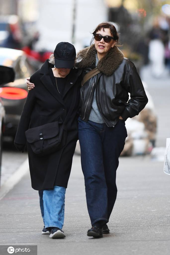 当地时间2026年4月9日,美国纽约,玛吉·吉伦哈尔与母亲娜奥米·福纳·吉伦哈尔现身街头。