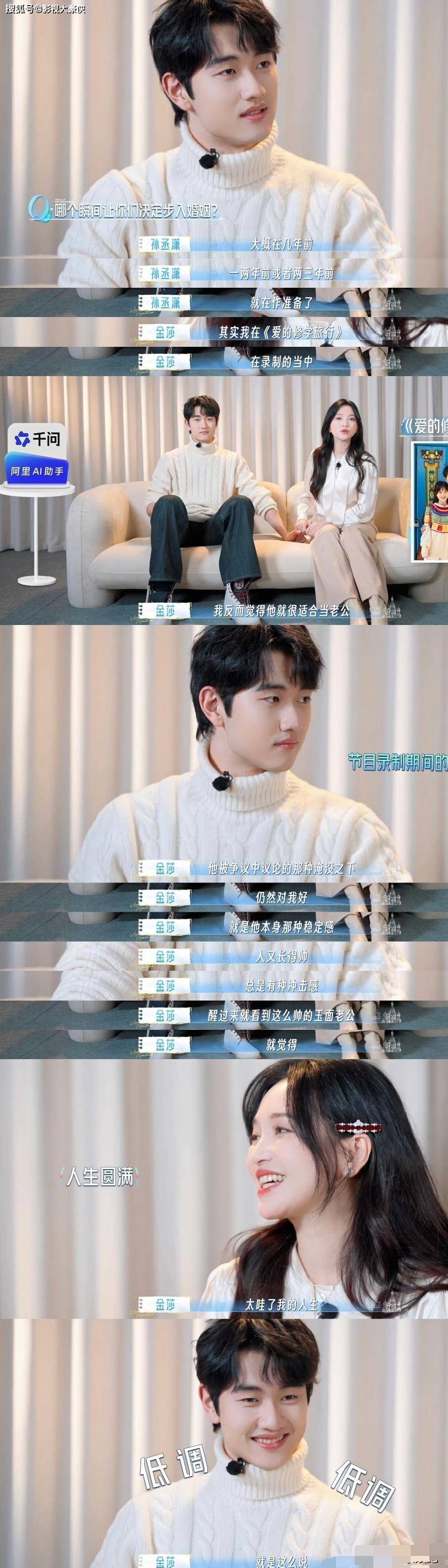 当天,两人共同参加的综艺《妻子的浪漫旅行2026》首期开播,金莎与孙丞潇在片中开单身派对,准备领证。孙丞潇透露,3年前就开始攒五金。金莎也否认两人为上节目而领证,并称“没有人会拿这件事开玩笑”。两人还笑言,去年12月微博发出的冰岛求婚视频其实拍了四遍。