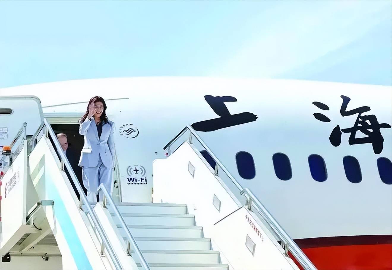 郑丽文这趟从上海飞北京,穿得还是那套利落的西服。