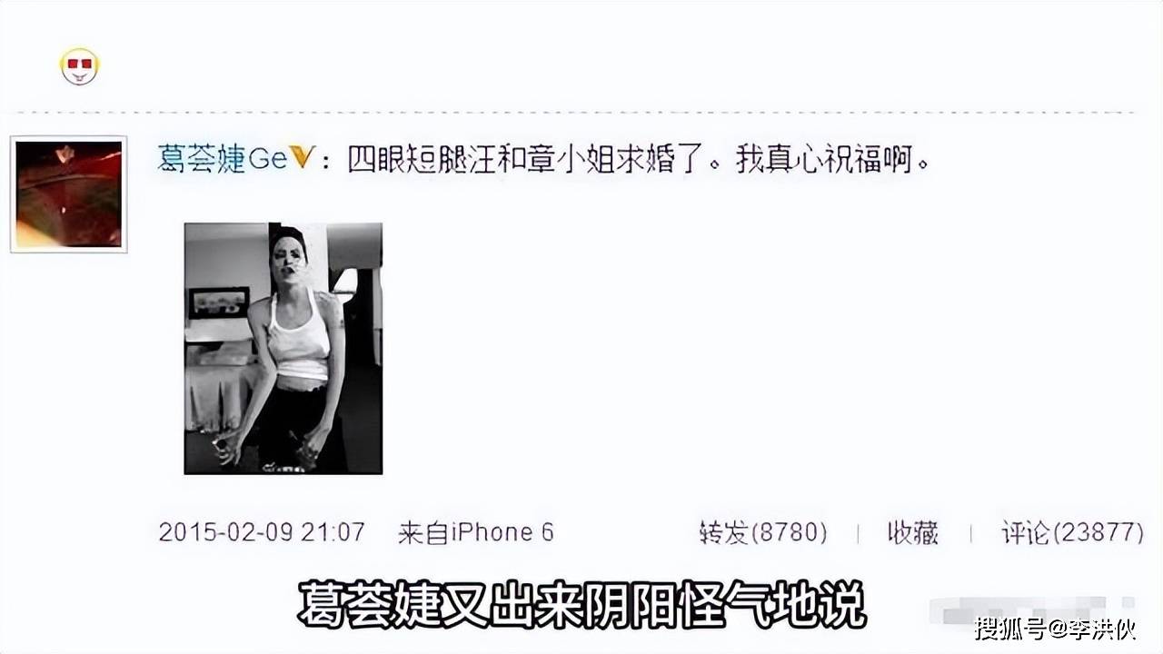 2015年,汪峰拿出一枚鸽子蛋大的钻戒跟章子怡求婚,这次葛荟婕骂得特别难听,说汪峰是“四眼短腿”,还阴阳怪气地说“我真祝福他们啊”。